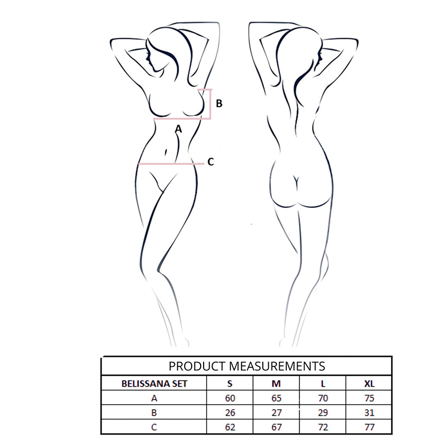 El conjunto BELISSANA combina sensualidad y elegancia moderna, diseñado para mujeres que aprecian la belleza sutil y el lujo en cada detalle. Elaborado íntegramente en delicada poliamida transparente, cautiva con su ligereza y delicadeza, a la vez que realza la belleza natural del cuerpo.
