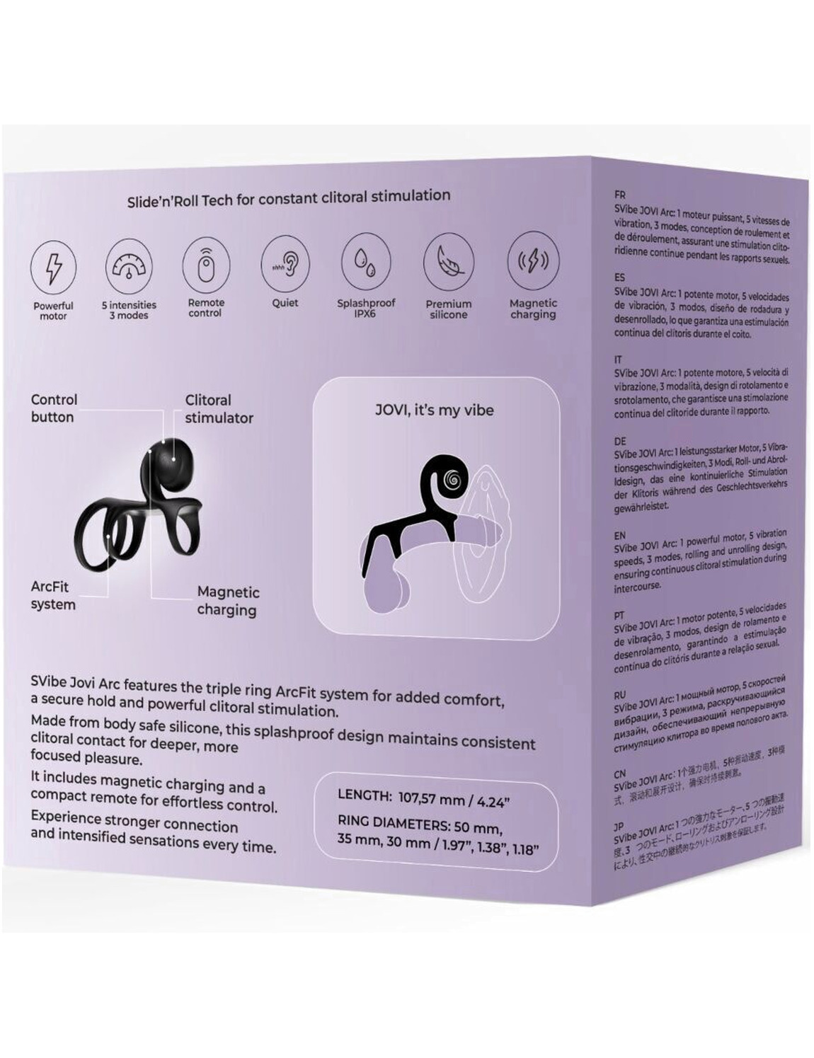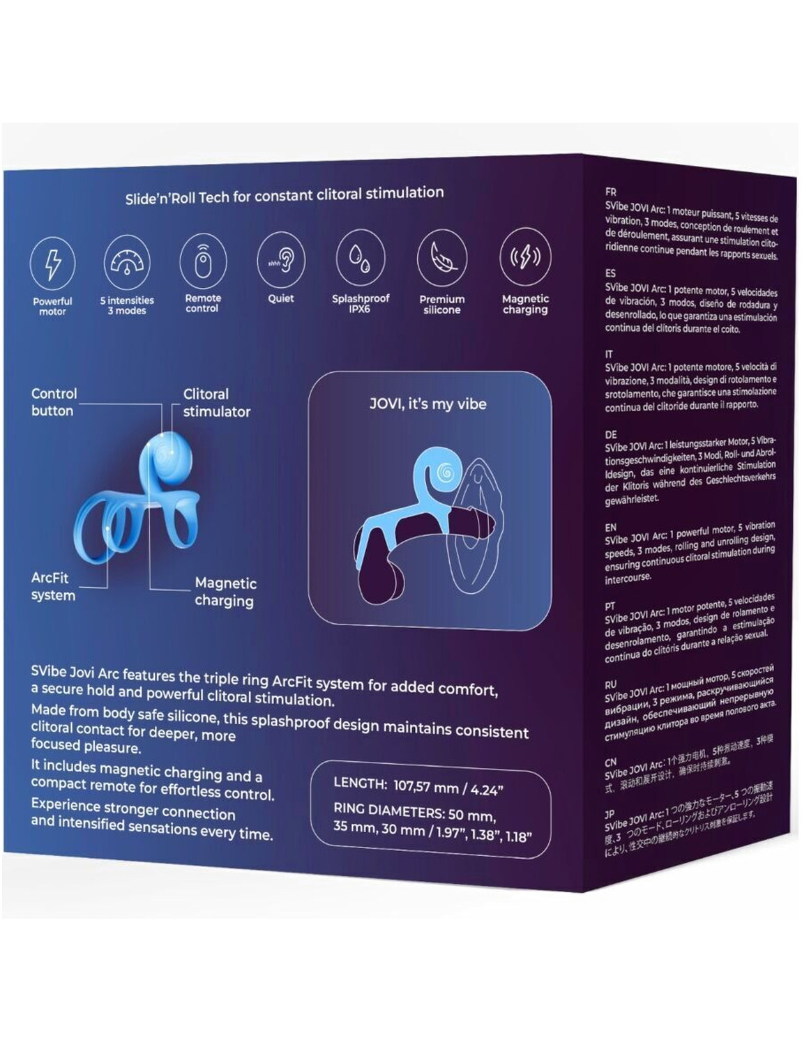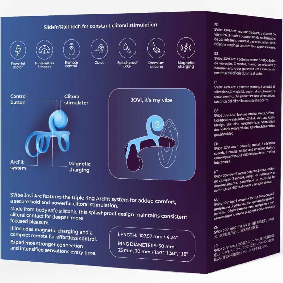 El SVibe Jovi Arc incorpora el avanzado sistema de triple anillo ArcFit, diseñado para ofrecer un ajuste excepcional que combina comodidad, estabilidad y un soporte seguro durante su uso. Gracias a esta estructura innovadora, el anillo se mantiene firmemente en su lugar, permitiendo disfrutar de una estimulación del clítoris potente, directa y constante sin necesidad de ajustes continuos.